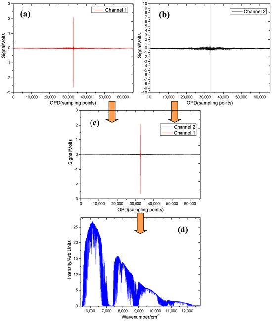 Figure 12 depicts the transition from an interferogram to a spectrogram. A raw interferogram, magnified by a factor of 1, is utilized as the data input for ADC channel one (Figure 12a). Similarly, another raw interferogram, magnified by a factor of 8, serves as the data input for ADC channel two (Figure 12b). After dividing all the data points on the combined two-channel interferogram by their respective gain magnifications, the recovered interferogram is created by selecting the 28/2 data points around the zero-phase difference (ZPD) of channel 1’s interferogram and incorporating all data from channel 2, excluding the overlapping data points from channel 1. This composite forms the final recovered interferogram (Figure 12c). It is evident that the dual-channel ADC acquires and processes the interferogram to produce a complete version, which undergoes preprocessing and FFT recovery before being converted into a spectrogram (Figure 12d).