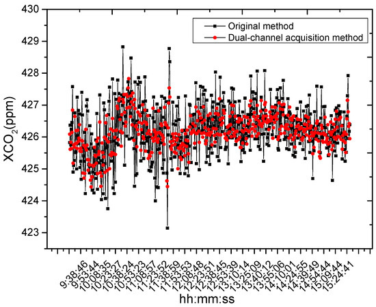 Since it is difficult to simulate the real ambient atmosphere in vertical column-concentration measurements, to further demonstrate the repeatability and reliability of the CO2 column-concentration measurement results, the ratio of the standard deviation to the daily average was employed to illustrate the variation relationship among data measured repeatedly on the same day. In 487 measurements, the accuracy of the CO2 column concentration, as measured by the traditional method, was 0.27%. The accuracy of the CO2 column concentration measured using the two-channel interferometric data acquisition method was 0.13%. The accuracy of the CO2 column concentration was calculated using the following formula: