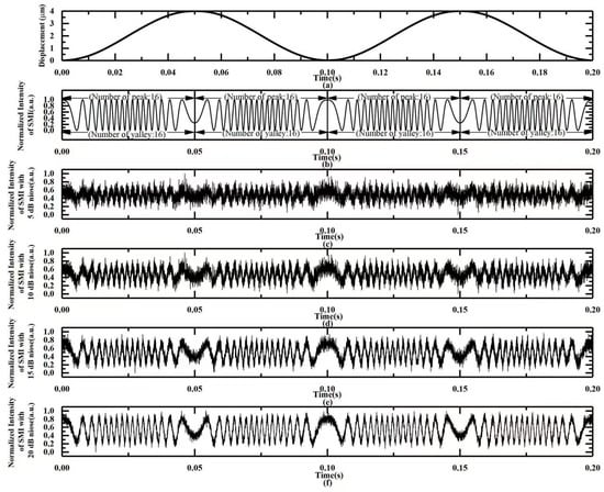 (a) The simulated vibration displacement of the object; (b) normalized intensity of simulated SMI signals; (c) normalized intensity of simulated SMI signals with 5 dB noise; (d) normalized intensity of simulated SMI signals with 10 dB noise; (e) normalized intensity of simulated SMI signals with 15 dB noise; (f) normalized intensity of simulated SMI signals with 20 dB noise.