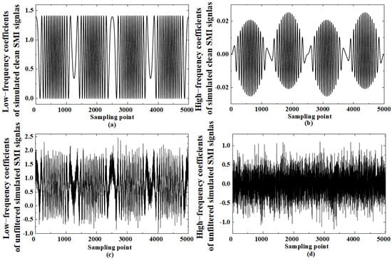 The low-frequency and high-frequency wavelet coefficients for the simulated clean SMI signals and simulated SMI signals with 10 dB noise, which are shown in Figure 2b,d, are obtained through the two-level wavelet transform decomposition. The results are shown in Figure 3. Figure 3a,b show the low-frequency coefficients and high-frequency coefficients for the simulated clean SMI signals. Figure 3c,d show the low-frequency coefficients and high-frequency coefficients for the simulated SMI signals with 10 dB noise.