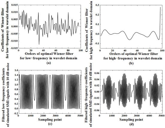 (a) The coefficients of optimal Wiener filter for low frequencies in wavelet domain; (b) the coefficients of optimal Wiener filter for high frequencies in wavelet domain; (c) filtered low-frequency coefficients of two-level wavelet decomposition for simulated SMI signals with 10 dB noise; (d) filtered high-frequency coefficients of two-level wavelet decomposition for simulated SMI signals with 10 dB noise.