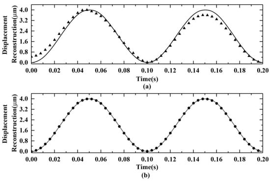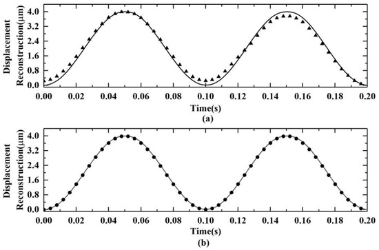 From Figure 6a,b, the SNR of denoised SMI signals varies greatly while the unfiltered signals have a 5 dB SNR. To further investigate the effect of the SNR of unfiltered simulated SMI signals on the displacement reconstruction error ratio, displacement reconstruction was conducted from unfiltered signals with a 5 dB SNR using the two filtering methods. Figure 8 illustrates the comparison between the simulated vibration displacement curve (solid line) and the displacement reconstruction curve after filtering from simulated SMI signals with 5 dB noise by two filtering methods. Figure 8a shows the results obtained through wavelet threshold filtering, while Figure 8b shows the results by Wiener filtering in the wavelet domain.
