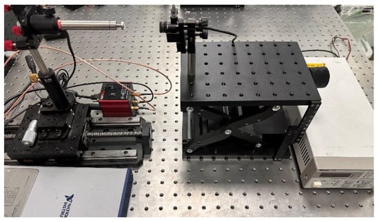 The SMI experimental system contains three modules: simulated vibration source, beam transmission, and data acquisition, which are shown in Figure 9. A semiconductor laser with a wavelength of 635 nm was selected as the light source, and the emitted light was reflected by a piezoelectric ceramic (PZT, Thorlabs China Inc., Shanghai, China). A piezoelectric controller (Thorlabs KPZ101, Thorlabs China Inc., Shanghai, China) was used to drive the PZT to generate a micro-displacement. The driving current of the laser diode controller (Thorlabs LDC205C, Thorlabs China Inc., Shanghai, China) is used to set the working current of the semiconductor laser. The mechanical translation platform was used to adjust the length of the external cavity. The SMI signals are converted and amplified by the current–voltage circuit, and the data are collected by the data acquisition card (NI USB-6341, Shanghai Huasui Electronic Technologies Inc., Xi’an, China). Finally, the SMI signals waveform is displayed on the computer [7].