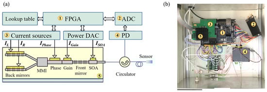 To construct a miniaturized, low-cost optical fiber white-light interferometry system, we selected a mature single-chip integrated semiconductor tunable laser—a modulated-grating Y-branch laser [39,40]—which has been extensively developed for dense wavelength division multiplexing applications in telecommunications. This laser achieves a broad scanning range for coarse wavelength tuning by injecting current into the left and right grating reflectors, while fine wavelength tuning is accomplished through phase current adjustments. The wavelength scanning range spans from 1528 nm to 1568 nm. In this work, we aimed to achieve a high spectral sampling rate without increasing hardware costs and to explore solutions to the dynamic measurement challenges posed by ultra-short cavities. The drive and data acquisition module for the sparse-sampled frequency-scanning white-light interferometry system is illustrated in Figure 1. The key modules are marked with numbers, and the corresponding photographs are shown in Figure 1b. The current source driver board integrates high-precision current sources (ADN8810, Analog Devices Inc., Middlesex County, MA, USA) to control the optical frequency and output power of the MG-Y laser (F7500, Finisar Corporation, San Jose, CA, USA). The laser outputs the optical signal, which enters the optical fiber sensor through the optical fiber circulator. The reflected light is detected by the photodetector (KY-PRM-200M-I-FA, Keyang Photonics, Beijing, China) and converted into digital signals that can be collected and transmitted by the FPGA development board via analog-to-digital converters (AD9226, Analog Devices Inc., USA).