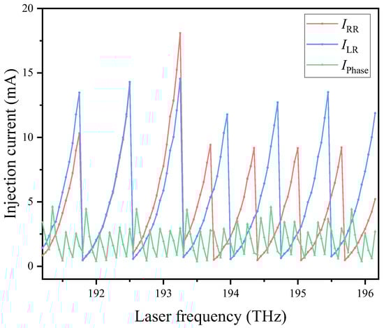 To simplify the subsequent phase demodulation, we determined the current tuning values for 100 optical frequencies spaced 50 GHz apart through automated testing of the MG-Y laser [41,42], enabling quasi-continuous optical frequency scanning from 191.2 THz to 196.15 THz by controlling the current sources. The current tuning curves are depicted in Figure 2. By pre-calibrating the current injected into the semiconductor optical amplifier (SOA), flat power output at different optical frequencies is achieved. The modulation frequency of the current sources is 500 kHz, resulting in a spectrum sampling rate of 5 kHz.