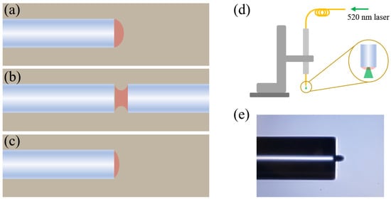 Schematic diagram of the sensor fabrication process. (a–c) Adsorption of photopolymer droplet film on optical fiber end face; (d) self-growing polymerization based on a 520 nm green laser; (e) microscopic image of a fiber tip humidity sensor.