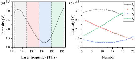 In order to achieve stable phase demodulation within a limited spectral range, we propose a four-step phase-shifting demodulation mechanism that is insensitive to the phase-shift step. Starting from the first sampling point, every 25 points are grouped together, and the interference spectrum is divided into four spectral segments with a fixed phase difference. As shown in the four sampling points in the rectangular area in Figure 4b, the optical frequency intervals in this group of data are equal at 1250 GHz, which means an equal phase-shift step in the static interference spectrum. The light intensity corresponding to the four sampling points satisfies: