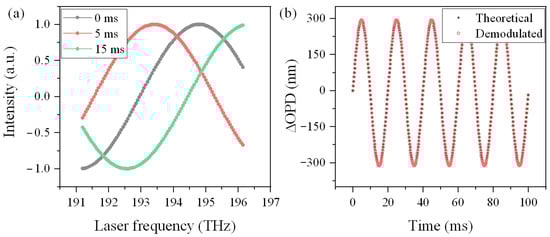 where ν0 is the initial optical frequency, n denotes the sampling point order, and Δt is the time interval, which is set to 0.2 ms in this work. Based on Equations (1) and (8)–(10), we can simulate the interference spectrum while accounting for the sampling time delay and subsequently calculate the four-step phase demodulation results.