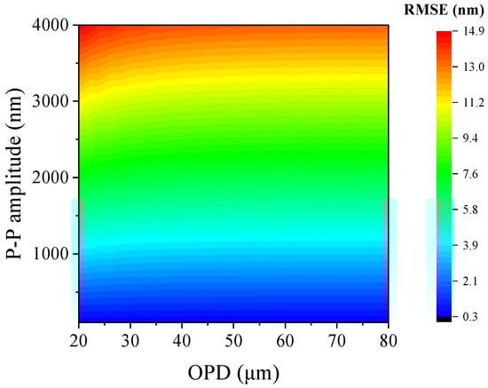 Figure 6 presents the RMSE map simulated using this method under the condition of a vibration frequency of 50 Hz, with the peak-to-peak amplitude range spanning from 0 to 4000 nm and the initial OPD set between 20 and 80 μm. It can be observed that the demodulation error is more significantly influenced by the amplitude of the dynamic signal than by the initial OPD. At the same vibration frequency, a larger amplitude results in a greater phase error introduced by the dynamic changes in the interferometer. In practical applications, the change in OPD of fiber tip sensors typically does not exceed 1 μm, ensuring the effectiveness of demodulation using this system.
