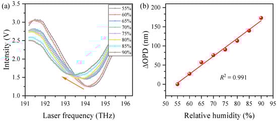 Experimental results of relative humidity detection. (a) The measured reflected spectra evolution with increasing humidity; (b) the ΔOPD at different humidities and the linear fitting results.