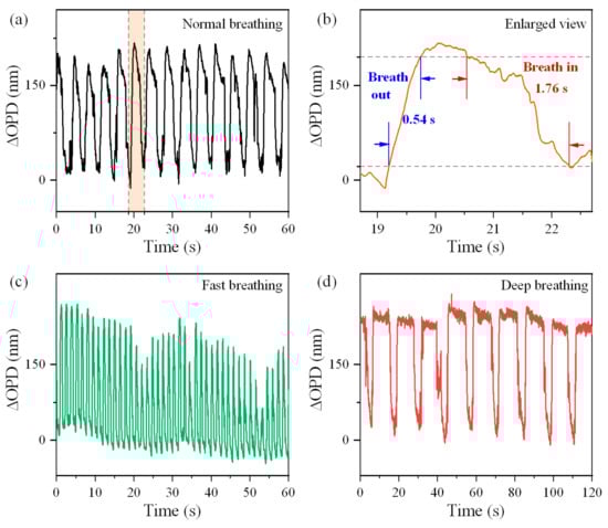 Before conducting human respiratory monitoring, we first utilized a laboratory humidity chamber (HWS-80, Huamai Instrument Manufacturing Co., Ltd., Shaoxing, China) to perform humidity sensitivity testing. The fiber tip humidity sensor developed in Section 2.2 was placed inside the humidity chamber, with an electrical hygrometer (TA66C, Suzhou TASI Electronics Co., Ltd., Suzhou, China) positioned nearby for environmental humidity calibration. The relative humidity in the experimental environment was adjusted in increments of 5%, covering a range from 55% to 90%. The resulting measured interference spectrum is presented in Figure 9a. It is evident that as humidity increased, the interference spectrum shifted towards longer wavelengths (lower frequencies, red-shift). Additionally, a trend of decreasing contrast in the interference spectrum was observed. Utilizing the four-step phase demodulation algorithm described in Section 2.3, we obtained the relationship curve between the relative humidity and OPD variation, as illustrated in Figure 9b. Within the measured humidity range, the sensor exhibited a good linear response, achieving a correlation coefficient of 0.991.
