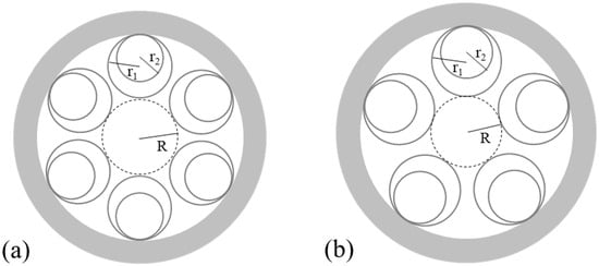 (a) Schematic of 6-capillary HCF; (b) Schematic of 5-capillary HCF. and represent the radii of the capillaries, while R denotes the radius of the fiber core.