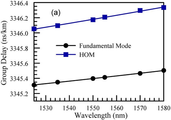 where k is an integer. Depending on the sign before , the time sequence from inverse Fourier transform can either have the same time sequence or the opposite one compared to the actual propagation times for each mode. With a proper choice of k, which can be chosen by searching around estimated group delay and the sign in Equation (3), one can de-alias the signal to obtain the full group delay for each mode []. The output pulse from the fiber can then be obtained based on an assumed input pulse ,