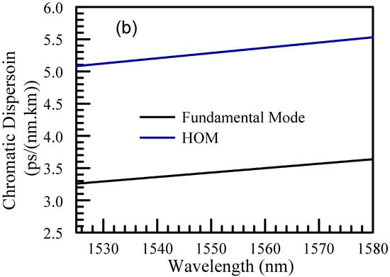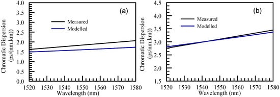 A comparison of the experimental results and modeled CD is shown in Figure 7 for the second and third HCF measured in Section 4. As can be seen, reasonable agreements between measurement and modeling have been achieved. In addition, in Refs. [,], 5-capillary DNANFs have also been reported as having low single-digit CD at the C-band with a positive CD slope, consistent with the findings in the current work.