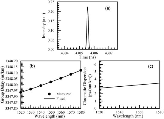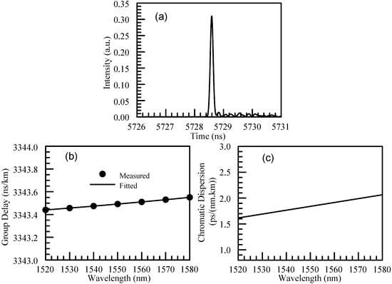The third fiber has a nested five-capillary structure shown in Figure 2b with a length of approximately 1300 m, which has better HOM suppression []. This fiber has a core diameter of 33.2 µm, an outer capillary average diameter of 37.7 µm, and a nested capillary average diameter of 19.9 µm. The fundamental mode MFD around 1550 nm is 28.5 μm. The fiber has a transmission window from 1300 to 1600 nm. The measurements were conducted from 1520 to 1580 nm with a 10 nm wavelength increment. Figure 6a shows the calculated output pulse by processing CTF following the procedure in [] and Section 2. Figure 6b shows that the fundamental mode delay is around 3348.02 ns/km, and it increases slightly over the wavelength. The GD data were fitted using a second-order polynomial, resulting in an R-squared value of 0.999989. Additionally, the CD of the fiber was obtained and is shown in Figure 6c, indicating a range of 2.76–3.45 ps/(nm.km) across the wavelength range of 1520–1580 nm.