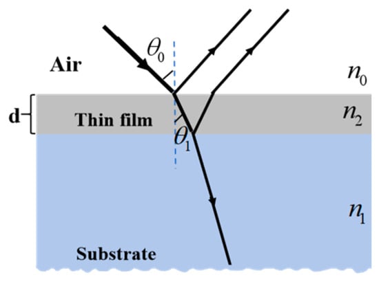 For an SnO2 film sample, it consists of three parts, namely the air/SnO2 film/glass substrate model, as shown in Figure 2. There are two interfaces for the optical model. One is the air/film interface and the other is the film/substrate interface. Hence, the Fresnel reflection coefficient cab be described as follows: