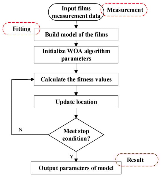 The framework of the data-fitting method is based on the WOA method, as shown in Figure 3, comprising four distinct parts. Based on that, the desired parameters of films can be obtained. It is worth noting that some parameters of the proposed method must be set. Herein, the maximum number of iterations is set to 60, and the number of individuals is set to 30.