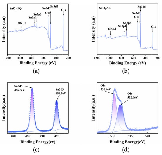 The survey spectra and detailed spectra; (a) survey spectra of SnO2-FQ; (b) survey spectra of SnO2-SL; (c) peaks of the Sn3d; (d) peaks of the O1s.