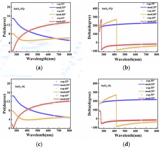 The fitting results of ellipsometry parameter curves ( and ): (a) Psi of SnO2-FQ film; (b) Delta of SnO2-FQ film; (c) Psi of SnO2-SL film; (d) Delta of SnO2-SL film.