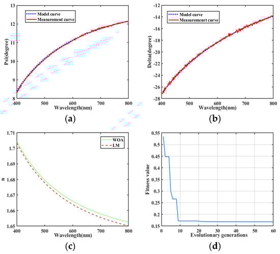 The process of ellipsometry data fitting involves a parametric optimization procedure. It is necessary to use the fitting algorithm to match the data measured ( and ) by SE and the data generated ( and ) by the model in the entire spectral range. The iterative fitting process is usually completed by the nonlinear LM algorithm. However, the LM algorithm is strongly dependent on good initial values of parameters and is easily trapped in local optimality. Herein, the WOA is utilized to fit measured data and model data. It has the ability to search globally and does not depend on the selection of the initial point. The mean square error parameter (MSE) is usually used to evaluate the fitting effect. Additionally, MSE is regarded as the evaluation function in the WOA. The MSE is defined as follows [13]: