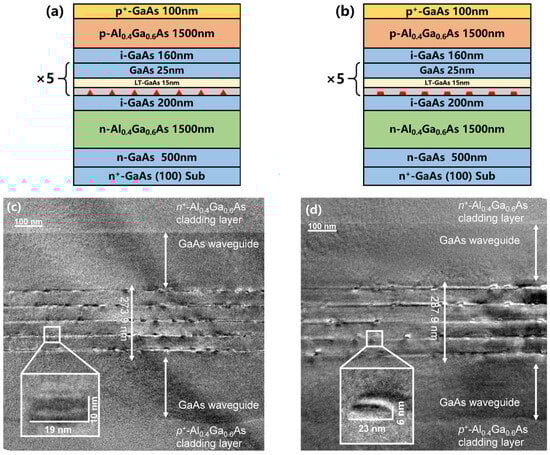 To evaluate the electrical properties, including the P-I-V curves and EL lasing spectrum, two kinds of p-i-n devices, consisting of five-stacked InAs/GaAs QD active regions based on the above epitaxial structures, were grown. The active region was sandwiched between a symmetrical layer structure schema, including a 200 nm waveguide layer and a 1500 nm Al0.4Ga0.6As cladding layer. Details of the epitaxial structures are available in ref. [5], and a schematic illustration of the complete device structure is shown below. Furthermore, cross-sectional TEM images are provided in Figure 1c,d; unflushed QDs with a pyramid shape have a lateral width of 19 nm and a height of 10 nm. For the flushed QDs with a truncated shape associated with the “trimmed” QDs in Figure 1b, the width and height are 23 nm and 6 nm, respectively. It is observed that the density distribution of flushed QDs is less than that of the unflushed sample, indicating that the In-flush procedure affects surface morphology.