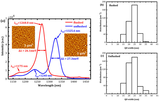 As depicted in Figure 2a, the room-temperature PL spectra of the two samples are shown in a red curve and a blue curve. The emission center wavelengths of the flushed and unflushed samples are 1268.8 nm and 1325.6 nm, respectively. The PL spectrum of the flushed sample exhibits a higher intensity and a narrower FWHM of 26.1 meV compared to the unflushed sample with a corresponding value of 27.3 meV. The 1 μm2 AFM images are also included in Figure 2a to represent the morphology properties in size uniformity and distribution. For the sample treated without thermal flush, the QD density was approximately 5 × 1010 cm−2, while the flushed sample displayed a slightly lower density of 4.5 × 1010 cm−2. The width size distribution statistics were derived from the AFM images to compare the uniformity. The flushed QDs predominantly ranged in size from 22 to 25 nm, whereas the unflushed QDs were distributed between 19 and 22 nm. Moreover, QDs with sizes larger than 35 nm were more frequently observed in the histogram statistic of Figure 2c, indicating a bimodal size distribution, and the In clusters observed in the AFM images led to the broadening of the PL spectra. In this case, the thermal flush treatment can not only significantly improve size uniformity and eliminate the extra surface In caused by a higher deposition rate, but it can also narrow the line width due to the greater confinement of carriers in the dots [15]. In addition, the emission wavelengths of the flushed QDs shift toward shorter wavelengths, causing a blue shift in peak position in the red curve. This can be attributed to the reduction in height along the vertical direction and In/Ga interdiffusion between QD and the surrounding barrier layers after thermal flushing [21].