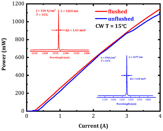 Single-side CW P-I curves of flushed (red) and unflushed (blue) QD lasers at 15 °C. The insets show the corresponding EL lasing spectra of the flushed QD laser at 0.24 A (red) and that of the unflushed QD laser at 0.34 A (blue).