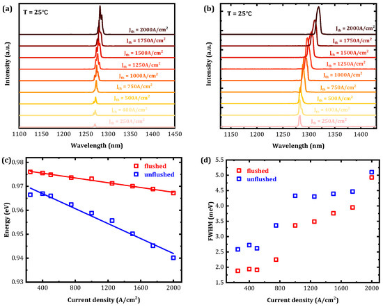 Room temperature emission spectra of the (a) flushed QD laser, recorded for injection current densities from 250 to 2000 A/cm2, and the (b) unflushed QD laser. (c) The center wavelength shift in EL spectra depends on the injection current density. (d) Comparing the broadening of the EL spectral line width depends on the injection current density.