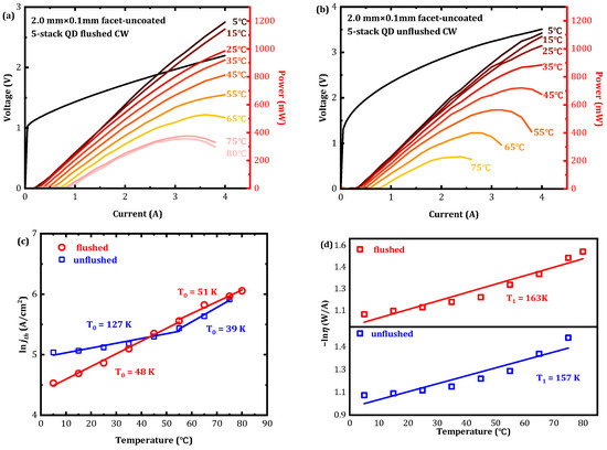 The electrical properties of these two lasers were then measured, and they are represented in Figure 5. The P-I curves shown in Figure 5a,b were measured at temperatures ranging from 5 to 80 °C under a CW current mode with the assistance of a temperature control thermoelectric cooler (TEC) module. Both laser diodes exhibit excellent high-temperature performance; the output power for the flushed QD laser exceeds 1200 mW at 5 °C, with a threshold current as low as 0.17 A. Although visible thermal degeneration occurred at 65 °C as the injection current increased, the output power still exceeded 300 mW at 80 °C, with a threshold current of 0.8 A. For the unflushed QD laser, the output power was as high as 1113 mW at 5 °C, when the threshold current is 0.32 A and the maximum output power at 75 °C exceeds 200 mW. Thermal degeneration was shown at 45 °C, with apparent power saturation, whereas for the flushed sample, this occurred at 65 °C.