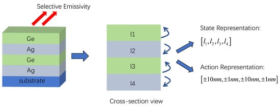 Reinforcement learning is a prominent artificial-intelligence algorithm that, unlike deep neural networks, does not require a pre-existing dataset. Instead, it learns and completes complex tasks through exploration and interaction with the environment. Deep reinforcement learning algorithms combine reinforcement learning with deep neural networks (DNNs), enabling agents to develop a more robust understanding of complex environments. These algorithms have been increasingly applied to the design of multilayer films and metamaterials in recent years. Jiang et al. employed Deep Q-Network (DQN) for the design of multilayer optical films, optimizing a solar absorber without any human intervention []. Liao et al. combined deep neural networks and the Proximal Policy Optimization algorithm for the intelligent design of flexible target chiral meta-surfaces, achieving optimal absolute circular dichroism values with high time efficiency in the training results []. Yu et al. proposed a general framework for emissivity engineering using DQN, which can be widely applied in the design of thermal metamaterials []. However, this method requires real-time computation of transmission matrices during intelligent design, leading to high computational costs.
