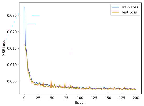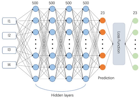 We obtained the dataset required for training the MLP using COMSOL Multiphysics 6.0. In data collection, build the model with reference to Figure 1. Apply periodic boundary conditions on the x–y plane, and let the light be incident along the negative z-axis. Treat l1, l2, l3, and l4 as parameters and perform parametric sweeps to obtain the absorption. The thicknesses l1 and l3 varied from 250 nm to 750 nm in increments of 50 nm, while l2 and l4 ranged from 5 nm to 45 nm in 5 nm increments. For the Ge layer, we perform a scan with a 50 nm step size, and for the Ag layer we use a 5 nm step size. This ensures that the resulting data uniformly cover the design space, thereby allowing more effective learning of the electromagnetic spectra within the parameter domain. In the subsequent design process, the design resolution for each layer is set to one-fifth of the scanning step size, thus maintaining design accuracy while making effective use of the MLP’s predictive capabilities. A total of 9801 sets of absorption spectrum data for different structures were collected. Of these, 80% were used for the training set and 20% for the test set. The data were then input into the MLP model for training, resulting in a well-trained spectral prediction surrogate model.