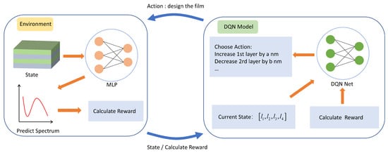Figure 3 illustrates how we transform the film design problem into the Markov Decision Process (MDP) framework required for reinforcement learning. The MDP is defined as , where S is the set of finite states, A is the set of finite actions, P represents the state transition probabilities, R is the reward function, and is the discount factor used to calculate the cumulative reward. At time t, the state of the environment is denoted as , which represents the thickness of each layer of the film at that moment, where belongs to the set S of all possible states. The action taken by the agent at time t is , which involves adjusting the thickness of the Ge layer by increments or decrements of 10 nm, and the Ag layer by increments or decrements of 1 nm, with belonging to the set A of possible actions. After the agent executes action , the environment transitions to the next state, . The environment then utilizes a well-trained multilayer perceptron (MLP) model to predict the absorption spectrum at the new state, . Based on this predicted absorption spectrum and a predefined reward function, the reward is calculated and returned to the agent. Based on the described process, the sequence from moment 0 to time t forms a Markov Decision Process (MDP). To design absorption spectra that closely approximate the ideal absorption spectra for infrared stealth, which ideally has very low absorption rates in the 3∼5 µm and 8∼14 µm ranges and high absorption rates in the 5∼8 µm range, and to guide the proper design process, a reward function is required. The deviation between the design outcome and the expectation can be evaluated based on RMSD []: