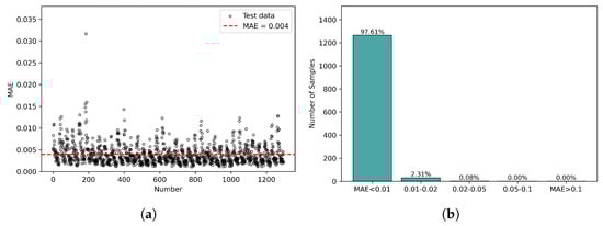 The MAE between the MLP-predicted values and the actual simulation results. (a) Scatter plot; (b) Statistical distribution histogram.