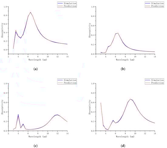 Comparison of MLP-predicted and simulated absorptivity for four cases of random thicknesses. (a) l1 = 300, l2 = 5, l3 = 350, l4 = 10; (b) l1 = 350, l2 = 20, l3 = 450, l4 = 25; (c) l1 = 690, l2 = 28, l3 = 550, l4 = 38; (d) l1 = 500, l2 = 10, l3 = 550, l4 = 40.