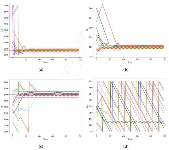 Convergence of the thickness of each layer under DQN conditioning. (a) Layer 1; (b) Layer 2; (c) Layer 3; (d) Layer 4.