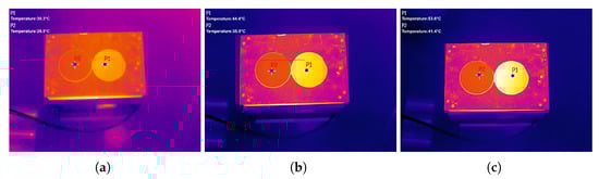 Infrared images of two materials at three different temperatures. (a) Heating stage set to 30 °C; (b) Heating stage set to 50 °C; (c) Heating stage set to 70 °C.