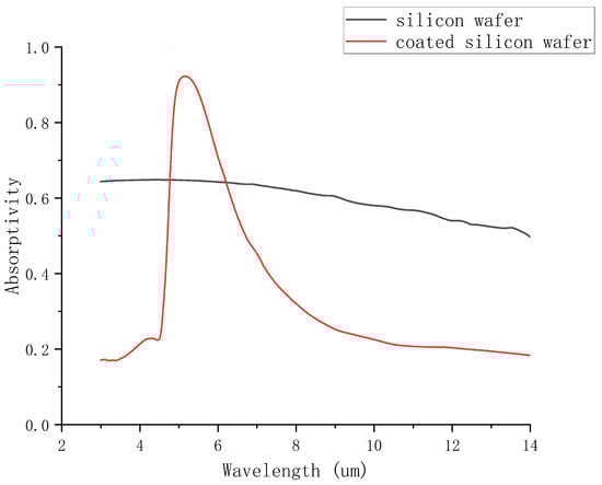 Following the designed film parameters, we deposited the film on a silicon wafer using a coating process to produce a physical sample. The coating process utilizes electron beam evaporation. The equipment employed is the SKY system from Shenyang Scientific Instruments, featuring a temperature control precision of ±0.2 °C and temperature uniformity within ±2 °C. For Ge sputtering, the pressure is maintained at 0.4 Pa, with a radio frequency power of 60 W. Ag sputtering is conducted at a pressure of 0.4 Pa using a direct current power of 50W. Both the coated silicon wafer and a bare silicon wafer were placed on a heating stage, and images were captured using an infrared thermal imager for comparative analysis. The heating stage was set to three different temperatures: 30 °C, 50 °C, and 70 °C. Measurements were conducted after heating to the target temperature was stabilized, with a heating duration of approximately 30 minutes. The results, as shown in Figure 10, indicate that the coated silicon wafer appears significantly darker in the infrared thermal imager compared to the uncoated silicon wafer, showing lower temperatures by 1.8 °C, 8.9 °C, and 12.2 °C at the respective heating temperatures. We also measured the emissivity of the two specimens, and the results are shown in Figure 11. The figure indicates that the emissivity of the silicon wafer significantly decreases in the 3∼5 µm and 8∼14 µm ranges after coating, while it increases in the 5∼8 µm range. This result is generally consistent with our simulation outcomes; however, some discrepancies do exist. These errors may be attributed to the following factors: inaccuracies in the actual coating process, leading to slight differences between the fabricated layer thicknesses and those used in the simulations; variations in the material parameters employed in practice compared to those in the simulations, as the optical properties of materials can differ under varying conditions; and minor contamination or oxidation of the materials during the processing or measurement stages. The experimental measurements presented above demonstrate that the designed thin film effectively regulates the emissivity of the silicon wafer within the infrared detection wavelength range, thereby validating its effectiveness for infrared stealth applications.