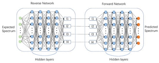 In recent research on multilayer film design, beyond intuitive methods based on human experience and intuition, there has been a growing focus on using efficient and intelligent approaches for inverse design []. The inverse design method generates the corresponding sample structure based on the target spectral properties. Classic optimization algorithms include genetic algorithms [,], evolutionary strategy [], simulated annealing [], particle swarm optimization [,], and topology optimization []. However, a limitation of these algorithms is that their computational complexity increases exponentially with the number of parameters. An alternative approach is using neural networks for the inverse design of material structures [,]. Liu et al. proposed using tandem neural networks in micro-nano photonic structure design to address the non-uniqueness problem encountered in the inverse design of photonic devices using deep neural networks []. Guan et al. applied tandem neural networks to the design of film colors in colored radiative cooling films, successfully identifying the bottom nano-cavity structures corresponding to arbitrary colors, thereby minimizing color matching errors []. Wang et al. introduced tandem neural networks into the design of circular hole metamaterials for infrared stealth, achieving multi-band compatible infrared stealth []. However, these deep neural network-based design methods can be labor-intensive, often requiring substantial amounts of training data and extensive data preprocessing.
