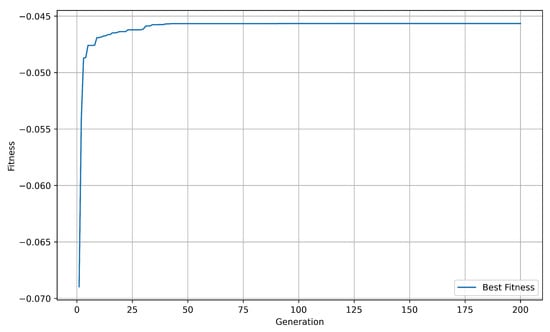 The genetic algorithm is also implemented based on the previously trained MLP. The initialization phase is similar to the earlier DQN environment, with the ranges for l1 and l3 set between 250 and 750 nm, and l2 and l4 set between 5nm and 45 nm. The target absorption spectrum is set to 0 in the ranges of 3∼5 µm and 8∼14 µm, and to 1 in the range of 5∼8 µm. The MSE between the predicted spectrum and the target spectrum is calculated, and its negative value is used as the fitness function for the genetic algorithm. The fitness improvement with the number of iterations is shown in Figure 14, and the optimal film thickness for each layer is ultimately output.