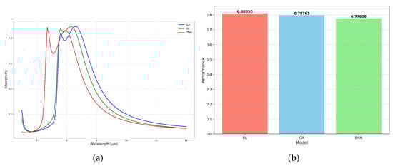 The design results from the three algorithms were subjected to electromagnetic simulations, yielding absorption spectra as shown in Figure 15a. To accurately assess the infrared stealth performance of the structures produced by the three algorithms, the following MAE calculation formula was established, and the performance of the design results was defined as 1-MAE. The performance of the design results from the three algorithms is presented in Figure 15b.