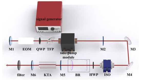Before entering the nonlinear frequency conversion unit, the 1064 nm burst-mode output beam was collimated using a beam reducer (BR), consisting of lens groups L1 and L2 with focal lengths of 200 mm and −200 mm, respectively. The spot sizes at the Q-switching repetition rates of 20 kHz, 40 kHz, and 50 kHz were determined to be 1400 μm, 930 μm, and 850 μm, respectively. To prevent the 1064 nm reflected laser from damaging components within the resonant cavity, an isolator (ISO) was positioned behind two 45° plane mirrors (M3 and M4) coated with high reflection (HR) films at 1.06 μm. The nonlinear frequency conversion unit featured a KTA crystal, cut at angles of θ = 90° and ϕ = 0°, with dimensions of 4 mm × 4 mm × 23 mm, placed in a water-cooled heat sink maintained at 20 °C. For optimal phase matching, a half-wave plate (HWP) was used. To enhance optical-to-optical conversion efficiency, a plano–plano cavity structure was employed. The input mirror M5 was HR coated at 1.4–1.6 μm and 3.3–4.0 μm, and HT coated at 1.05–1.1 μm, while the flat output mirror M6 was HR coated at 1.05–1.1 μm and 1.35–2.0 μm, and HT coated at 2.5–4.2 μm. To measure the output energy and conversion efficiency of the nonlinear frequency conversion laser, a germanium plate was utilized for filtering, exhibiting strong absorption at 1.064 μm and high transmittance at 3.5 μm. A signal generator (922pro, Rigol, Suzhou, China) was used to set the pump repetition rates to 100 Hz and 200 Hz, with a pump duration of 250 μs. The electro-optical module (EOM) repetition rates were set to 20 kHz, 40 kHz, and 50 kHz, with a duration of 1 μs. The laser output power was measured using a power meter (PM100D, Thorlabs, Newton, NJ, USA).