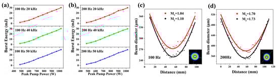 The output 1064 nm burst-mode laser energy versus the peak pump power for various burst repetition rates of (a) 100 Hz and (b) 200 Hz; the beam quality factors of the 1064 nm burst-mode laser at (c) 100 Hz and (d) 200 Hz.
