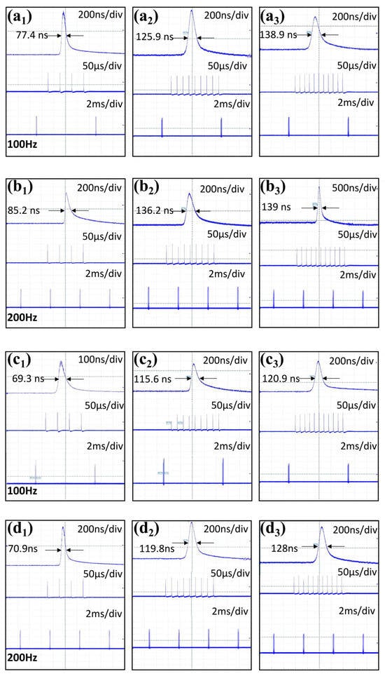 The output 1064 nm fundamental frequency laser at a pump repetition rate of 100 Hz for a sub-pulse repetition rate of 20 kHz (a1), 40 kHz (a2), and 50 kHz (a3); 200 Hz for 20 kHz (b1), 40 kHz (b2), and 50 kHz (b3); 3.5 μm MIR laser of 100 Hz for a sub-pulse repetition rate of 20 kHz (c1), 40 kHz (c2), and 50 kHz (c3); 200 Hz for 20 kHz (d1), 40 kHz (d2), and 50 kHz (d3).