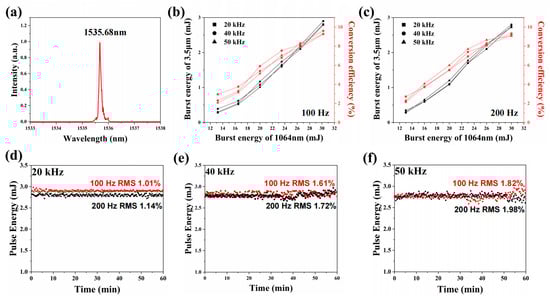 Due to the limitations of available instruments, a suitable pulse spectrometer covering the 3.5 μm range was not accessible to directly measure the output wavelength of the KTA-OPO. Therefore, the idler wavelength was calculated by measuring the signal wavelength in the cavity after the OPO process. As shown in Figure 4a, the central wavelength of the signal light was measured to be 1535.68 nm, and the corresponding idler wavelength was calculated to be 3.47 μm. Figure 4b,c illustrate the relationship between output energy, conversion efficiency, and 1064 nm pump energy of the mid-infrared 3.5 μm burst-mode laser at varying pump and Q-switching repetition rates. As the pump energy of the burst-mode 1064 nm fundamental frequency laser increased, the average output energy of the MIR 3.5 μm laser also increased gradually. It can be observed that since the single-pulse energy density of the 1064 nm fundamental frequency laser incident on the KTA crystal remained constant, the conversion efficiency of the generated 3.5 μm laser was comparable under different conditions. When the 1064 nm pump energy reached 30 mJ, the highest output burst energy of the 3.5 μm laser was 2.9 mJ, 2.81 mJ, and 2.79 mJ at a pump repetition rate of 100 Hz, as well as 2.8 mJ, 2.75 mJ, and 2.72 mJ at 200 Hz. Due to increased thermal effects at 200 Hz, the beam quality of the 1064 nm burst-mode laser degraded compared to that at 100 Hz, resulting in a slight reduction in output energy. At this point, the optical-to-optical conversion efficiency of the OPO was 9.6%, 9.3%, and 9.3% at 100 Hz, as well as 9.3%, 9.2%, and 9.1% at 200 Hz, respectively. As shown in Figure 4c–e, the pulse energy stability of the 3.5 μm MIR laser was measured over 60 min, with results of 1.01% and 1.14% at 20 kHz, 1.61% and 1.72% at 40 kHz, as well as 1.82% and 1.98% at 50 kHz.