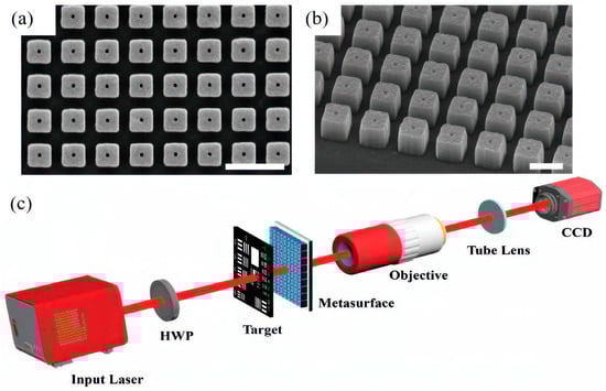 (a,b) Silicon hollow brick metasurface sample; (c) experimental setup for edge detection imaging.