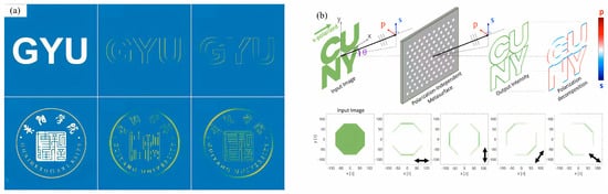 In March 2023, ZHANG et al. [68] proposed a fully optical image edge detection method based on the two-dimensional photonic spin Hall effect in anisotropic metamaterials. By designing a specific anisotropic metasurface, differently polarized light can propagate at varying speeds along the optical axis, thereby enhancing edge information in the image, as shown in Figure 6a. By altering the geometric dimensions of the metasurface, tunable one-dimensional edge detection and directional two-dimensional edge detection can be achieved, with the ability to modulate the imaging resolution by adjusting the magnitudes of transverse and in-plane displacements. In the same year, Michele Cotrufo et al. [69] proposed a silicon-based metasurface. By changing three geometric parameters, the lattice constant, hole radius, and plate thickness, this design achieves a strongly polarization-asymmetric or nearly polarization-independent response while maintaining a high degree of isotropy. It does not rely on the 4f imaging system. The metasurface with a strongly polarization-asymmetric response can enable controllable direction-dependent edge detection, as shown in Figure 6b.