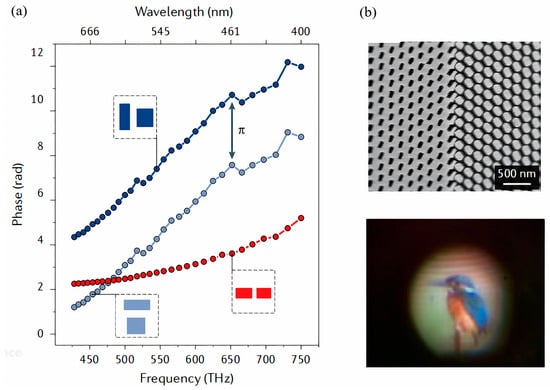 MKhorasaninejad et al. [79] designed a metal lens with a negative dispersion effect, in which the focal length increases with the wavelength. Experiments demonstrated a chromatic aberration correction response with a 60 nm bandwidth in the visible range. By cascading metal lenses with opposite dispersion characteristics, a wider bandwidth chromatic aberration-corrected lens can be achieved. Similar design principles can be applied to realize transmission-type chromatic aberration-corrected metal lenses, and the use of materials with higher refractive indices can increase the operating bandwidth of reflection-type chromatic aberration-corrected metal lenses, as shown in Figure 9b.
