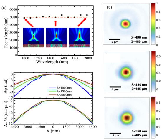 (a) Achromatic plasmonic lens. From top to bottom are the focal lengths of the designed achromatic lens at different wavelengths in sequence. Electric field intensity. The inset shows the E2 distribution at wavelengths λ = 1000 nm, 1500 nm, and 2000 nm; the simulated numerical (solid line) and ideal (dashed line) phase distributions at 200 nm above the output surface at wavelengths λ = 1000 nm (blue), 1500 nm (green), and 2000 nm (red); the simulated spatial distribution of at wavelengths λ = 1000 nm (blue), 1500 nm (green), and 2000 nm (red). (b) Intensity distribution of the achromatic metalens (AML) at a fixed position of z = 485 μm under three wavelengths of 490 nm, 520 nm, and 550 nm.