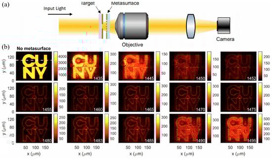 (a) Diagram of the imaging device. (b) The original image is shown in the top left, with the output images obtained for different wavelengths in the other panels.