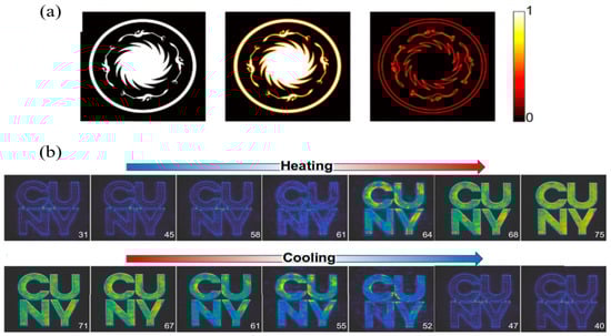 (a) Left: original image. Middle: focused imaging. Right: edge detection imaging. (b) Output images at different temperatures during heating and cooling.